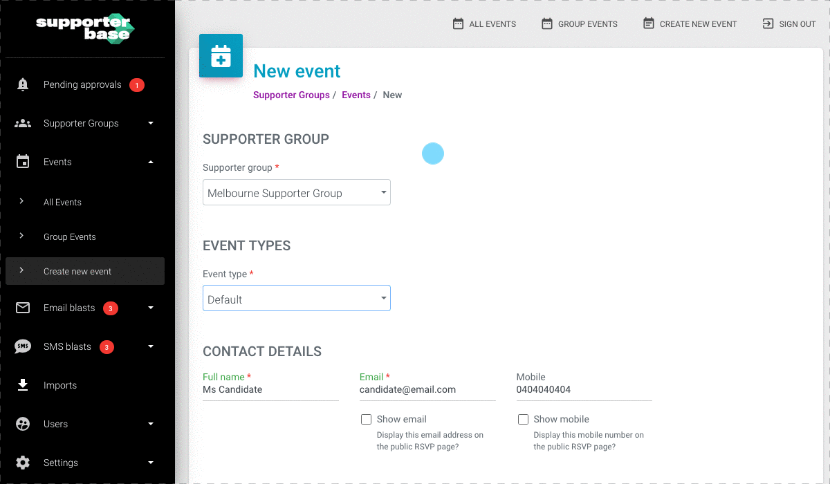 Let’s walk you through the simple process of how your volunteer leaders can create, manage and drive attendance at events using SupporterBase and your website…