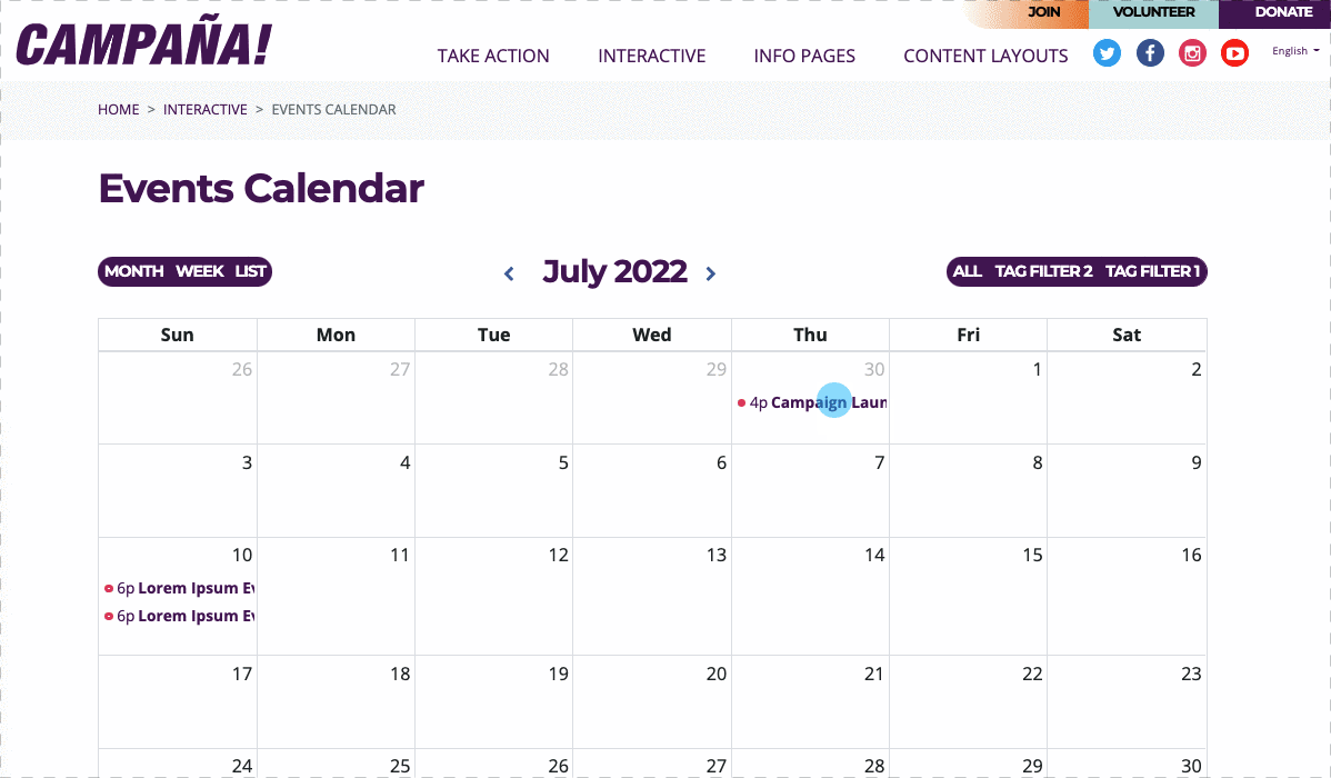 This event can appear on your NationBuilder website’s calendar page for supporters to RSVP. We can also help you set up a system of filters for your calendar page, to help supporters sort by the type of event they are interested in (i.e. “door knocking”) or location.